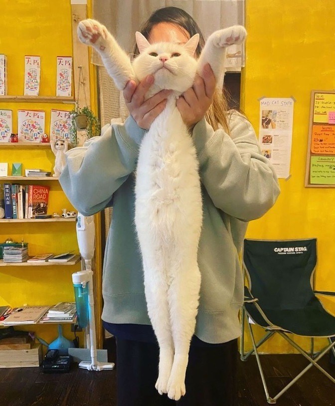 Presenting the incredible, the meow-velous, the purr-longed feline sensation! Behold, as this dazzling white cat appears to stretch on for miles, defying the laws of cat physics. We can't help but wonder if this kitty has a secret stretching power or if it's simply a fluffy optical illusion.