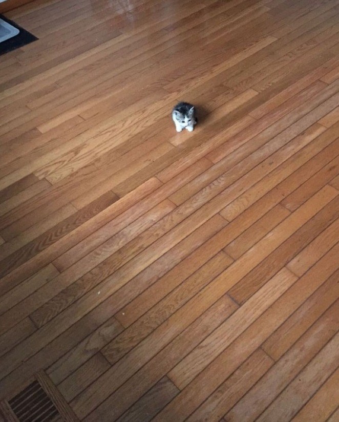 Feast your eyes on this minuscule marvel, a tiny kitten so small it barely takes up 5% of the entire photo! Sitting adorably on the hardwood floor, this pocket-sized furball looks like a speck of cuteness amidst the vast expanse of their surroundings.