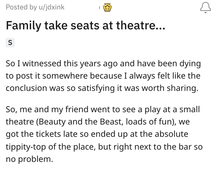 This theatre-goer shared an incident they witnessed in which an entitled family took another group's place, piling the other group's things in a seat in front of them. As infuriating as this is to imagine, it ended up going pretty well for the other group. Keep reading to see screenshots of this brilliant story. For more, check out this entitled bride who asked for a refund on her wedding photos years later when she got divorced.