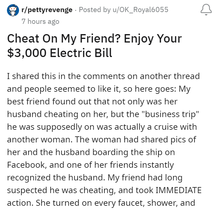 'Enjoy your $3,000 bill': Cheating husband gets his comeuppance after affair on cruise, livid wife leaves water and electricity running for 9 straight days