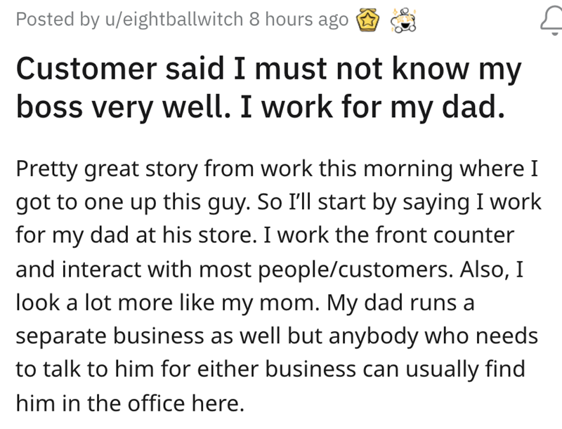 This customer got more than they bargained for when they tried to shame the customer service person they were dealing with and strong-arm them into giving them some parts for free by name-dropping the owner of the business and claiming that the owner would have done the deal so they obviously "Didn't know him.'" Well, the customer service person happened to be the owner's son, so it turns out they knew him pretty well.