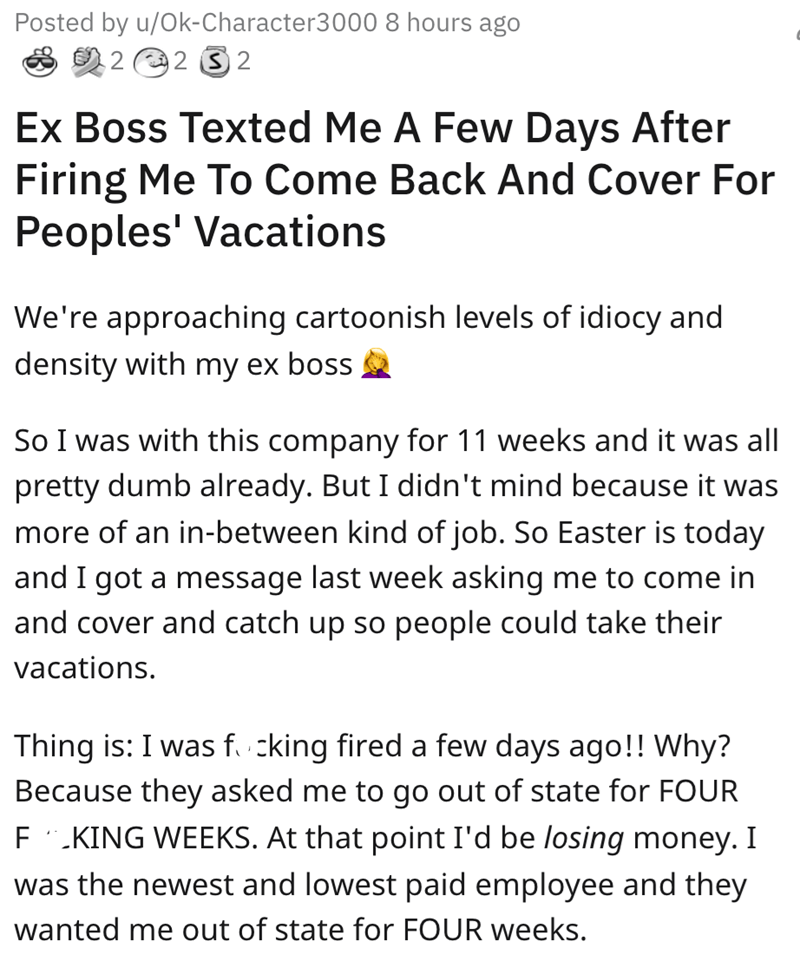 After their boss had sufficiently rubbed salt in the wound, Redditor u/Ok-Character3000 took to Reddit's r/antiwork subreddit to share their experience, detailing the circumstances that led to their firing and the events that took place after. Commenters were dumbfounded and made their thoughts heard, ripping the employer apart.