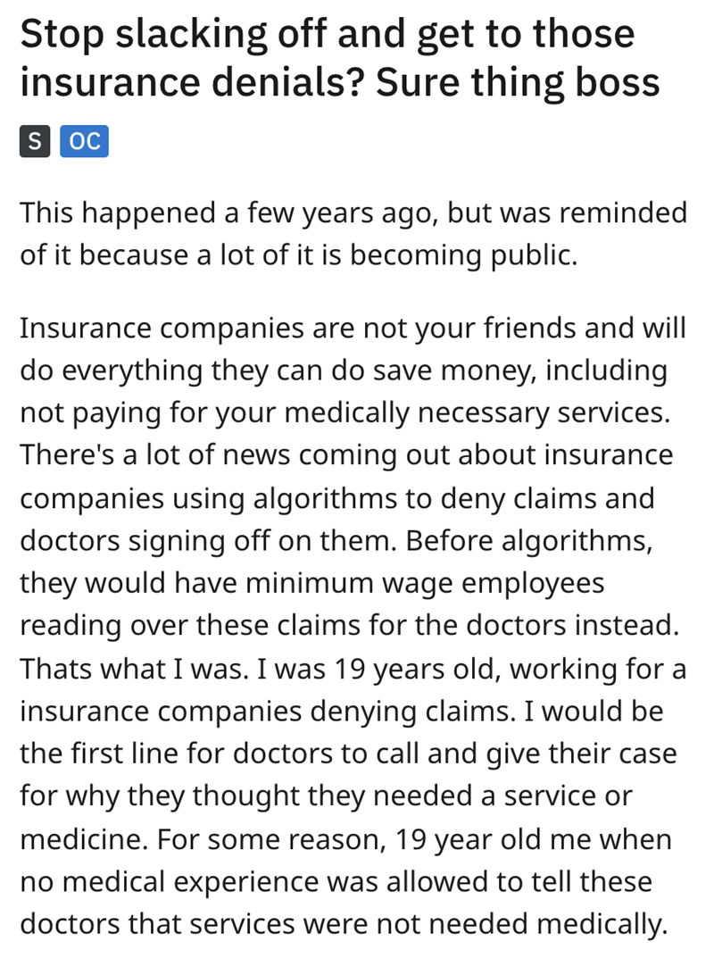 That's the chance that this worker had at the medical insurance firm where they worked; their job was to talk to patient's doctors, who would make a case for why their patient needed a particular treatment; they were then to deny as many claims as the company could possibly get away with. They share that the job was "miserable," but at least it was easy. They eventually got pulled up by their boss for spending too much time reviewing each case, leading to an order from their boss with which they could maliciously comply and do right by the patients.