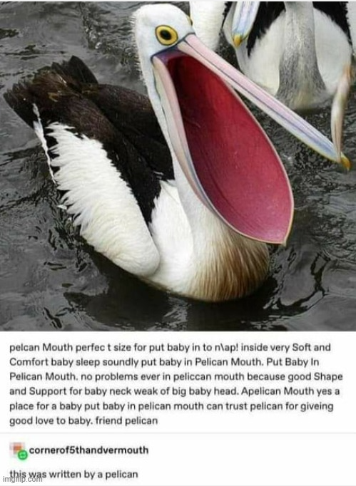 These feathery pelican friends may look like they're just minding their own business, but don't be fooled - they're one sassy and chaotic animal. Just look at how clearly a pelican wrote this Tumblr post to lure a baby into its mouth!