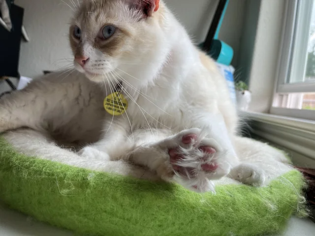 Feast your eyes on this charming calico cat, who's proudly flaunting her vibrant pink toe beans for all to see! With a harmonious mix of colors on her fur and the cutest bubblegum pink pads contrasting against it, she's truly a walking work of art.