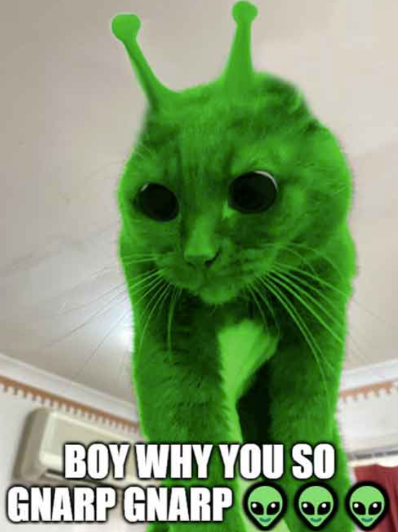 Alienposting is exactly what the name implies: a genre of sh*tpost with an extraterrestrial flavor. Its main figureheads are kittens and puppies reimagined as alien beings. It comes complete with their own nonsensical language that focuses a lot on the 'gn' phonic, and kind of looks like written Simlish. Baby animals and the little green men that are the most popular depiction of our cosmic neighbors might not be the most obvious combination, but that's exactly the point. This isn't a trend that you need to understand to enjoy, because you literally can't. We are from the planet Earth after all.