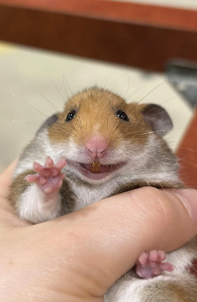 This hamster who's showcasing some seriously small-scale 'smilestones' has decided to greet the world with a grin that could power a thousand hamster wheels. And let's be honest, who needs a tooth fairy when you've got a tooth fur-ry this cute?"