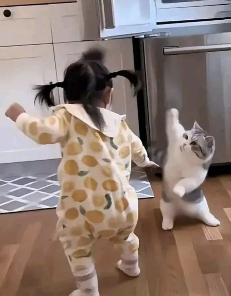 This is a dance battle of epic proportions! Who will win - the toddler decked out in sour lemons, ready to make her opponent squint from sourness? Or the cat that boasts a face that is enough to send anyone into cuteness overload?