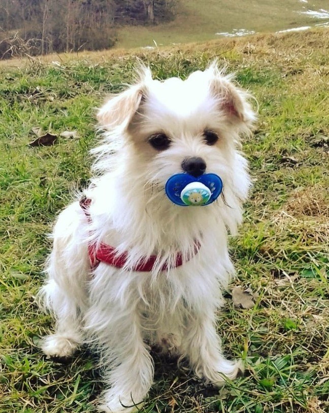 Meet the ultimate baby-faced contender in the doggy dummy department. With his fluffy white coat and an aqua pacifier perfectly placed, he is serving up cuteness on a level that's simply "paw-fficient."