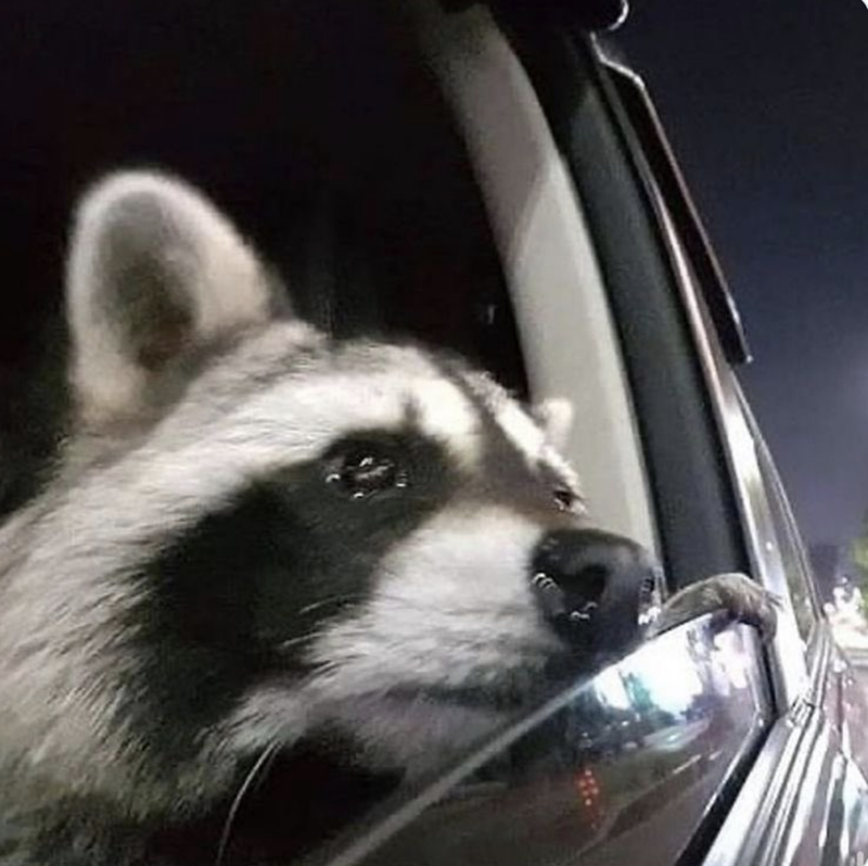 See? Raccoons can be super cute too. He even fits in a tiny half of your steering wheel! Don't let him drive though, you'll always end up at the dump, or going headfirst into a huge garbage can. Too smelly for us!