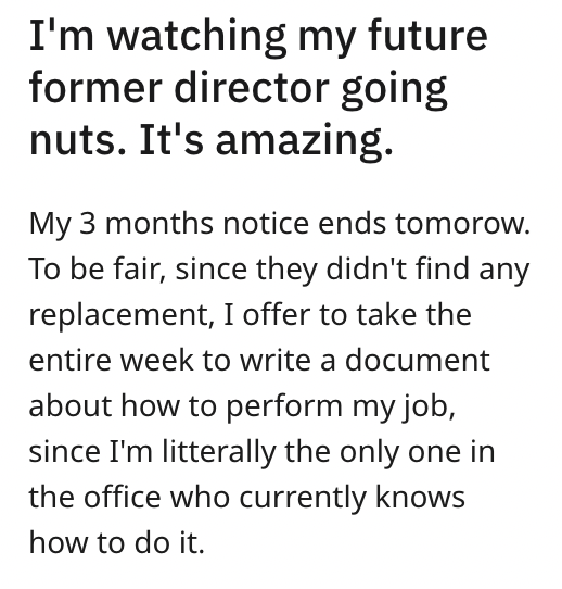 'My director [...] is going absolutely nuts': Engineer transitions out of the company, boss finally discovers how doomed they are