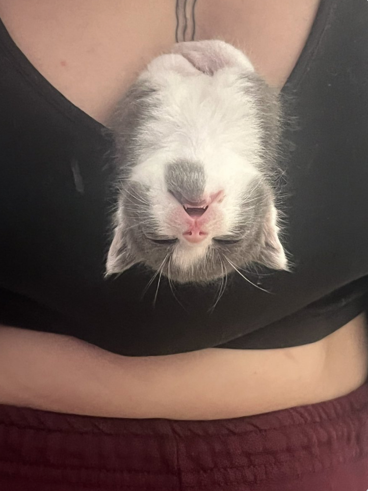 Just a casual cat nap upside down hanging from my owner's top, no big deal. We also like to nap upside down. In fact, we do it almost every day to improve blood flow. If you couldn't guess already, our tone of voice right now is dripping with sarcasm.