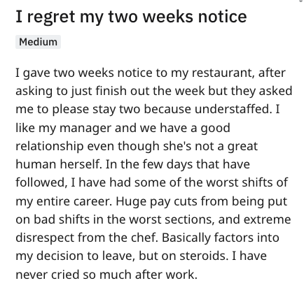 'I regret my two weeks notice': Server faces backlash from coworkers after quitting