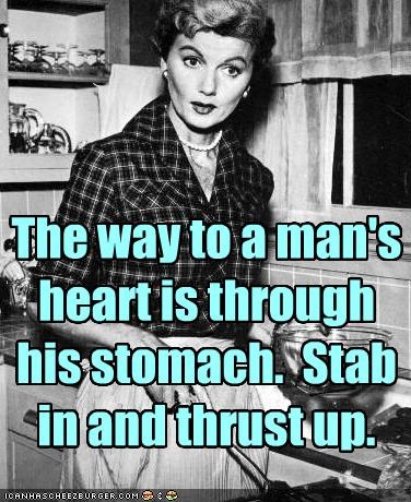 The way to a man's heart is through his stomach. Stab in and thrust up.