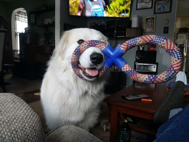 Meet our furry friend, a certified 'fetchinado' who firmly believes that there's no such thing as 'too much fun'. As you can see, he's taken his passion for playtime to a whole new level. Who said chew toys were just for chewing? This visionary pooch is pioneering the groundbreaking trend of 'toy-face'