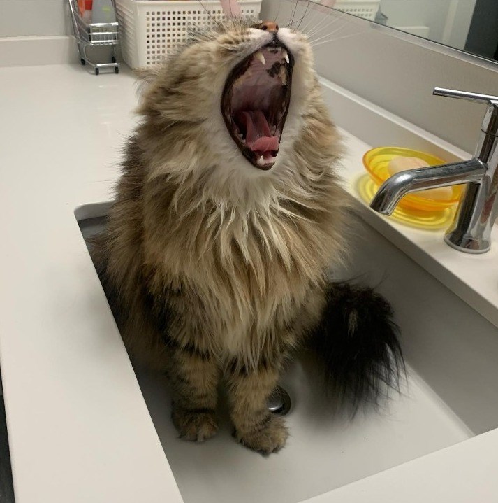 Taking the term 'basin bassinet' to a whole new level, this feline virtuoso lets out a mighty yawn mid-siesta in the sink. It's a daring act of defiance against traditional napping norms and the ultimate 'purrformance' in bathroom acoustics
