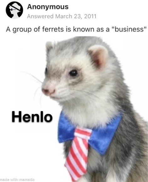 Welcome to Business Ferret Incorporated, the cutest, derpiest, and most efficient ferret business place for doing business with ferrets in the whole of Business Island for Ferrets. Would you like to try our free one-day trial, where a business of ferrets handles your business, the ferret way?