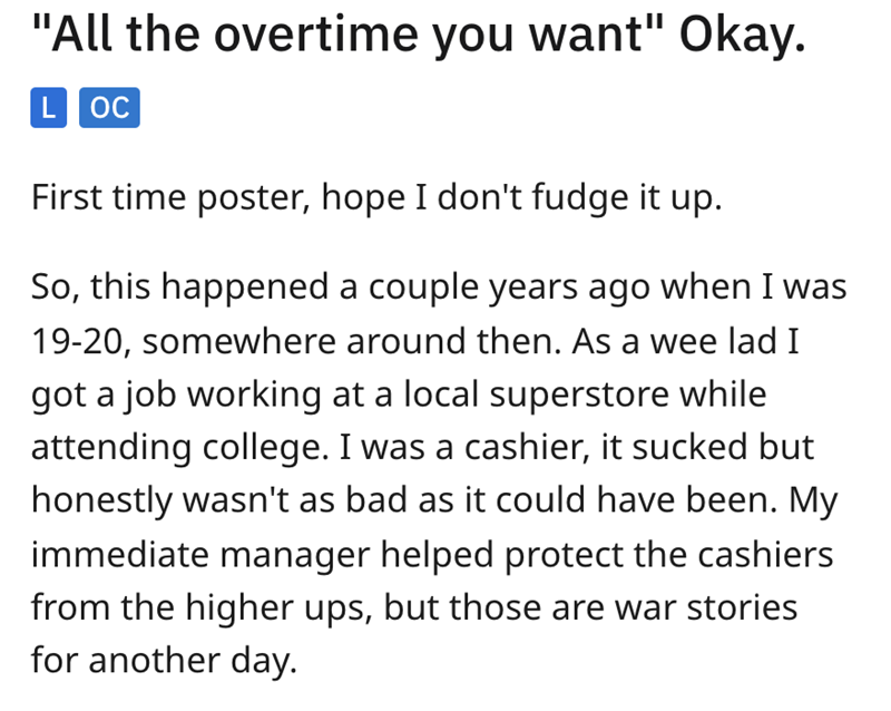 Still, while overtime can really grind you into the ground over extended periods of time, when you're studying or just out of school it can feel incredible to work a lot for short bursts and make what feels like fistfuls of cash. So, when the chance presented itself and this cashier was told to work as much as they'd like… they obliged, earning tons through overtime over a short period.