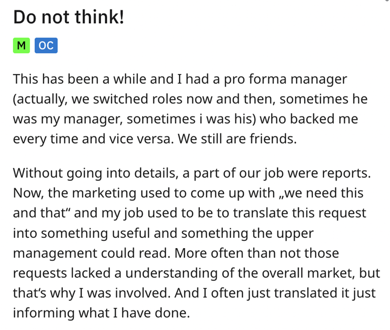 This worker shared their story of maliciously complying with their manager's request that they "do not think" when doing their job—with the manager, themself, likely giving the demand out of exasperated frustration with their own bosses.