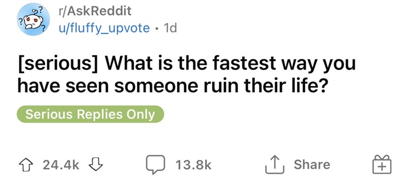 Font - r/AskReddit u/fluffy_upvote • 1d [serious] What is the fastest way you have seen someone ruin their life? Serious Replies Only 24.4k ↓ 13.8k ↑ Share T