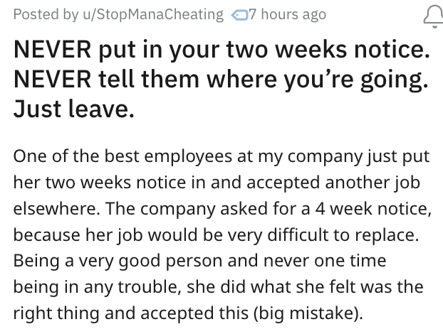 There's some dubiousness to the truth behind this post, and, let's be honest—as with anything you read online—there often is. But this thread sparked an important fervor of discussion around something I think is an important topic: How much information about your personal life do you owe your employer? If you're taking a sick day—do they need to know why? If you're leaving your position—do they need to know why? The answer, in any case, is no. Your employer doesn't need to know more than the extent it affects their operations. You're off for the day and won't be in, or you're leaving for good, respectively—end of story.