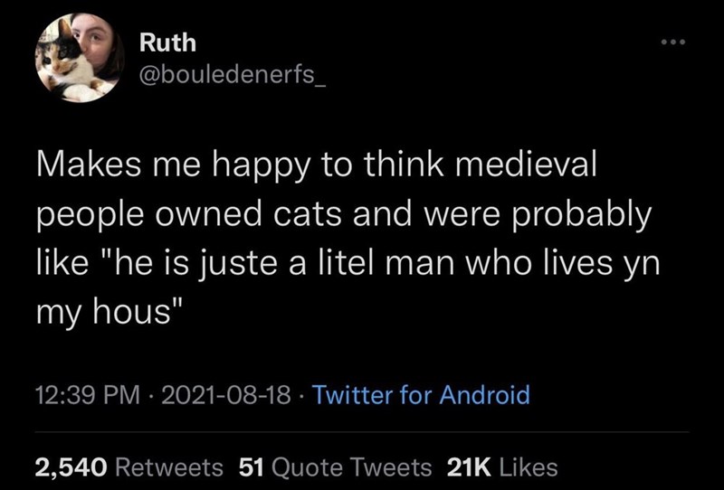 "Hark! Mine feline companion, thou art a creature of grace and mirth, forsooth, a joy to mine heart. Thou art a whiskered muse, thy antics bring laughter to the soul, a delightful dance of furry delight."