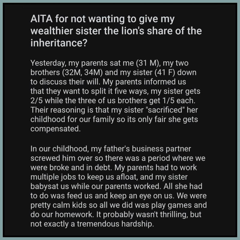 Entitled Brother Gets Slammed for Complaining About Sharing Inheritance With Older Sister Who Raised Him