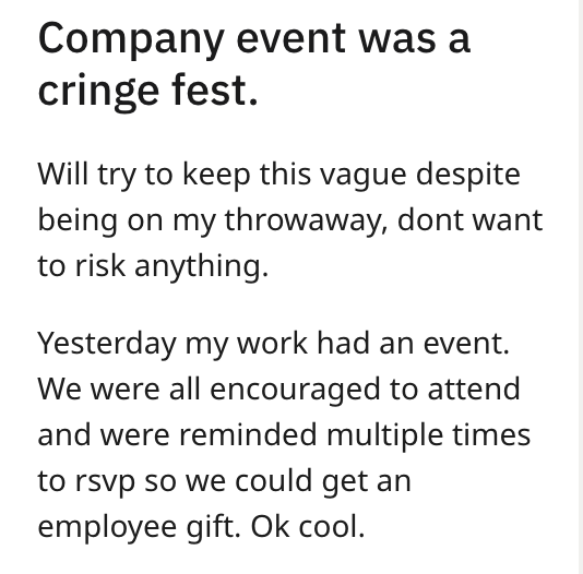 'Company event was a cringe fest': CEO requires underpaid employees to attend company event, gloats about himself the whole time
