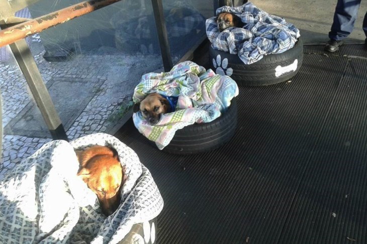 The employees at a bus stop in Brazil came across three local dogs who appeared to be cold as they scavenged outside, looking for food and shelter. They allowed the dogs (Max, Pitoco and Zoinho) to come inside the station for the winter season in Brazil and even fashioned new beds for the trio using old tires. The story of the generous employees was posted by local passerby and animal lover, Fabiane Rosa. "These communal dogs have a much more dignified life than some who are victims of maltreatment and neglect, hidden behind the walls," Rosa said in her post. "This world is not the privilege of humans, God created animals to teach us to love without conditions"