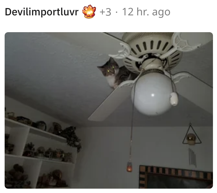 Who needs a luxury cat bed when you have a ceiling fan? From the ceiling fan, you can look down judgmentally at all of your hoomans without ever having to move. Also, if it keeps spinning, you get a 360 view without ever having to move your head. Sounds purrfect!