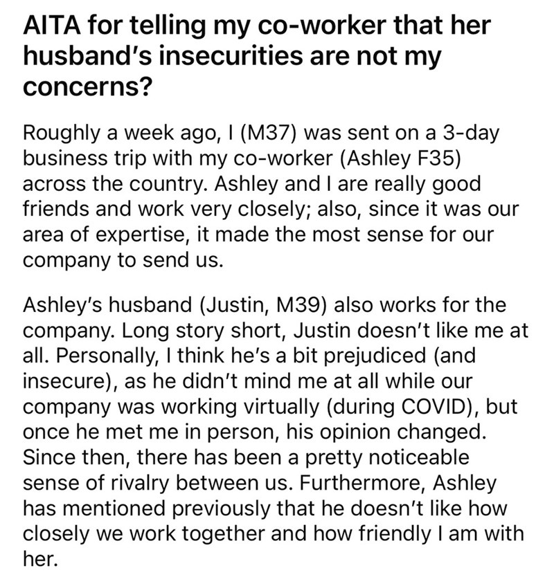 Man Tells Co-Worker to Ignore Her Husband's Insecurities During Business Trip