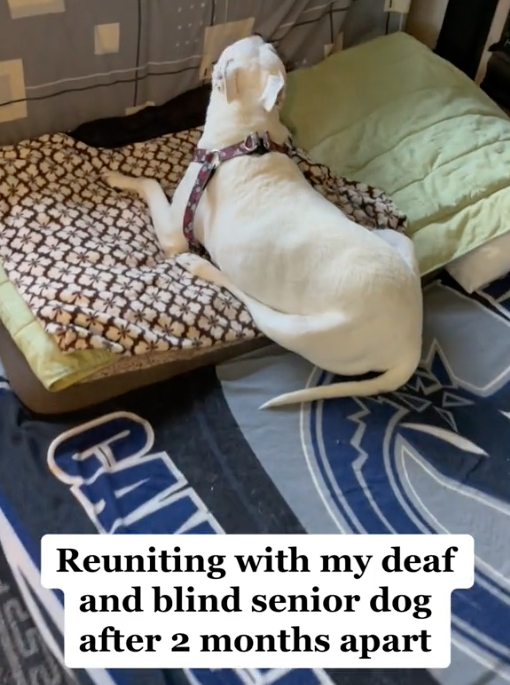 The sweet pup named Halo is a senior dog (all dogs are pups to us no matter their age) and is now deaf and blind due to her old age. Her owner, Rachel, had to travel for 2 months. How can you tell a dog that you'll be back in 2 months? Unfortunately, you can't and it's heartbreaking. She recorded their reunion and it is the most precious thing you will watch all week, maybe even all year! She slowly approaches Halo and you can see the dog can tell someone is there, but can't figure out who.