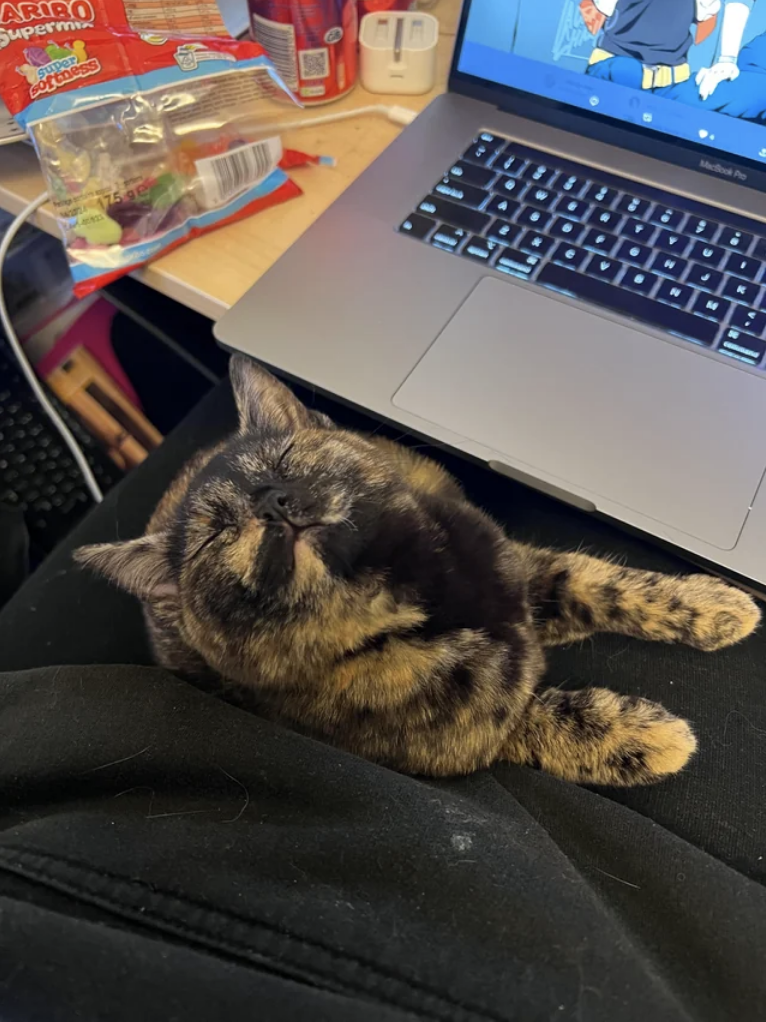 Now that is a happy cat! The closed eyes, that smile, the head back in pure feline bliss, yup! This tortie wears her heart on her sleeve, and now our heart is all aflutter because we simply cannot handle how adorable this is!