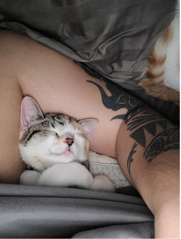 This. This is all we want in life. Well, this and a million dollars. No, a billion dollars! That way we can spend all day tucked in with a kitty sleeping on our chest or snuggled up next to us and not have to worry about leaving them to go to work.