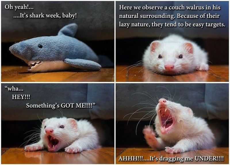 Ferrets have that wonderful overdramatic gene, which leads to such hissterical moments such as this. Thankfully, no ferrets were munched by sharks in the making of this meme, but it sure is an accurate representation of what happens out at sea. So next time you see a ferret lying on a rock, maybe take a few steps back.
