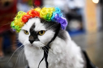 This kittys got a new do, and it's purr-fectly fabulous! Rocking a short, curly, and oh-so-vibrant wig, this feline is serving looks that'll make even the birds stop and stare. Move over, fashionistas; there's a new trendsetter in town, and it's the cat-titude we all need right meow!