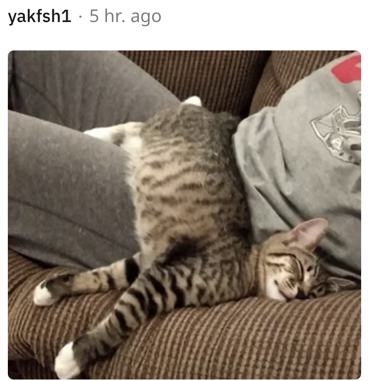 Exhibit A - purrfectly relaxed. You can tell by the fact that its body has reverted back to its liquid state, spilling over the leg and sleeping soundly. It must be really comfortable, despite its entire body weight resting on its smooshed little face. Adorable!