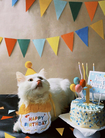 This adorable cat really knows how to celebrate in style, with party decorations and a cute little birthday hat, this is a party we wouldn't want to miss. Grab a party had and join in on this purrfect party celebration.