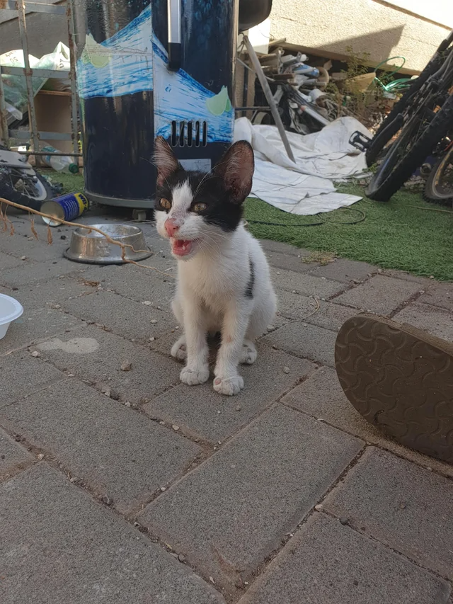 "A couple of days ago we lost our black and white 11 years old cat, today this kitten came to eat outside our house."