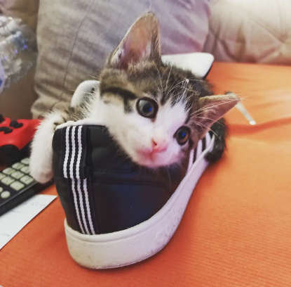 This aww-dorable kitty brings instant joy, it has found the purr-fect resting place and we cannot get enough, we can't help but stare at it's charming little face as it is snug as a bug in this black and white sneaker.