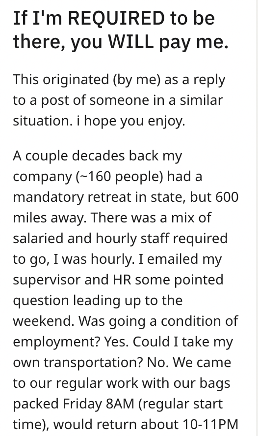 'You WILL pay me': Employee confronted by boss for billing overtime for mandatory company retreat, HR unable to deny payment