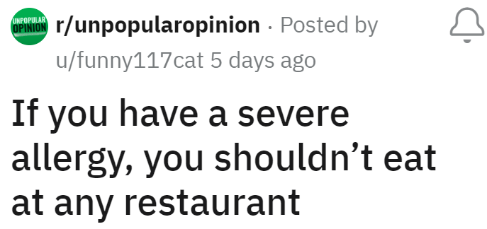 Font - UNPOPULAR OPINIE r/unpopularopinion Posted by u/funny117cat 5 days ago If you have a severe allergy, you shouldn't eat at any restaurant