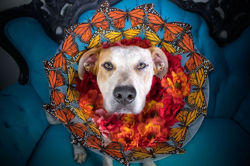 "Cone of fame" is a beautifully decorated cone courtesy of artist and animal center volunteer Erin Einbender, Who started the decoration project in order to help dogs get adopted. After designing and crafting the stylish cones, she photographed adoptable pups at "One Tail at a Time" wearing them. Here are some photos of this wonderful project.