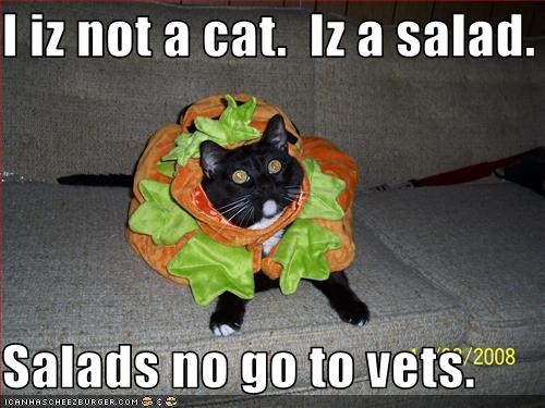 I iz not a cat. Iz a salad. Salads no go to vets.