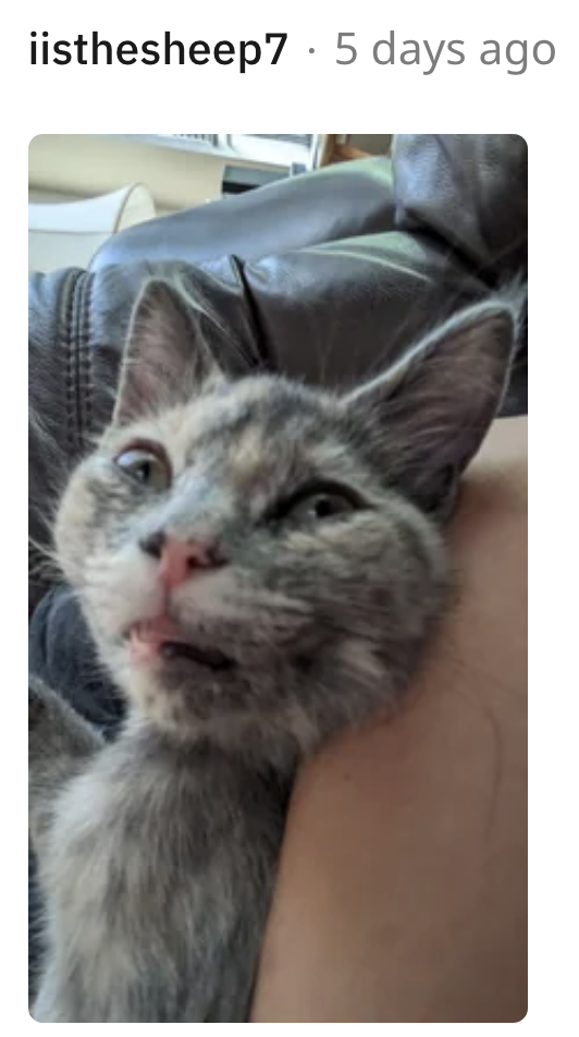 This cat is making that face because she just saw her hooman stub her toe, again. Or, she just stubbed her paw on something. Expecting sympathy from a cat is a rookie mistake. It's okay, little nugget, we'll give you some tuna and you'll forget all about that ouchie!
