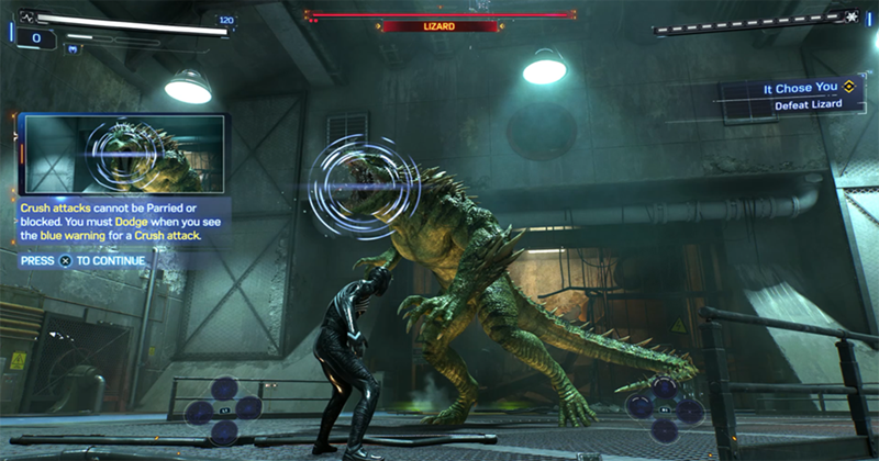 The fight against Lizard has three phases (four if you count a chase sequence in the middle). We recommend having all of your abilities set to Peter's symbiote powers and not any of the Spider-Tech abilities. Not only can they deal good damage if you have upgraded them, but they can interrupt his attacks in crucial moments. Also, don't forget to press in L3 and R3 to activate your Venom Surge ability to deal heavy damage when you have it available.
