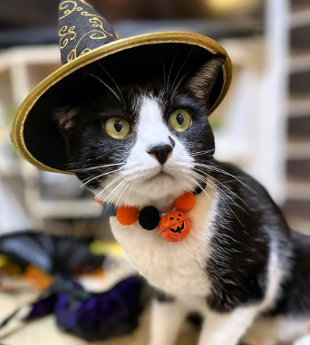 This aww-dorable feline is dressed in its spookiest costume, it looks all set to haunt the streets with its cuteness as it trick and treats on Halloween night. This black and white furry feline is purr-fectly content to unleash some spooky fun.
