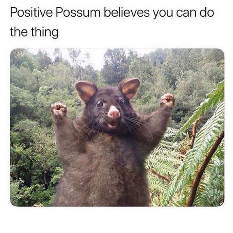 First up from the animal kingdom is the nimble positivity possum who is here to remind you that you can do the thing. And if you are hearing that from positivity possum you know that you have to give it your all and do the thing, as it is likely that positivity possum is right and that you can in fact do the thing. So stop sitting there and go do the thing!