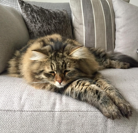 This cute cat has taken ownership of this couch with pawsitive charm, this aww-dorable kitty has purr-fectly mastered the art of laziness, and we can't help but feel instant joy courtesy of this charming feline.