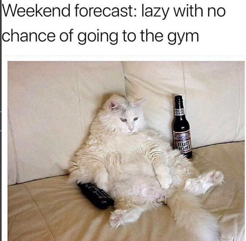 This is the type of weekend forecast we are talking about, this aww-dorable comfortable feline is mastering caturday in the best way possible, chilling on the sofa with the tv remote and a fun drink.